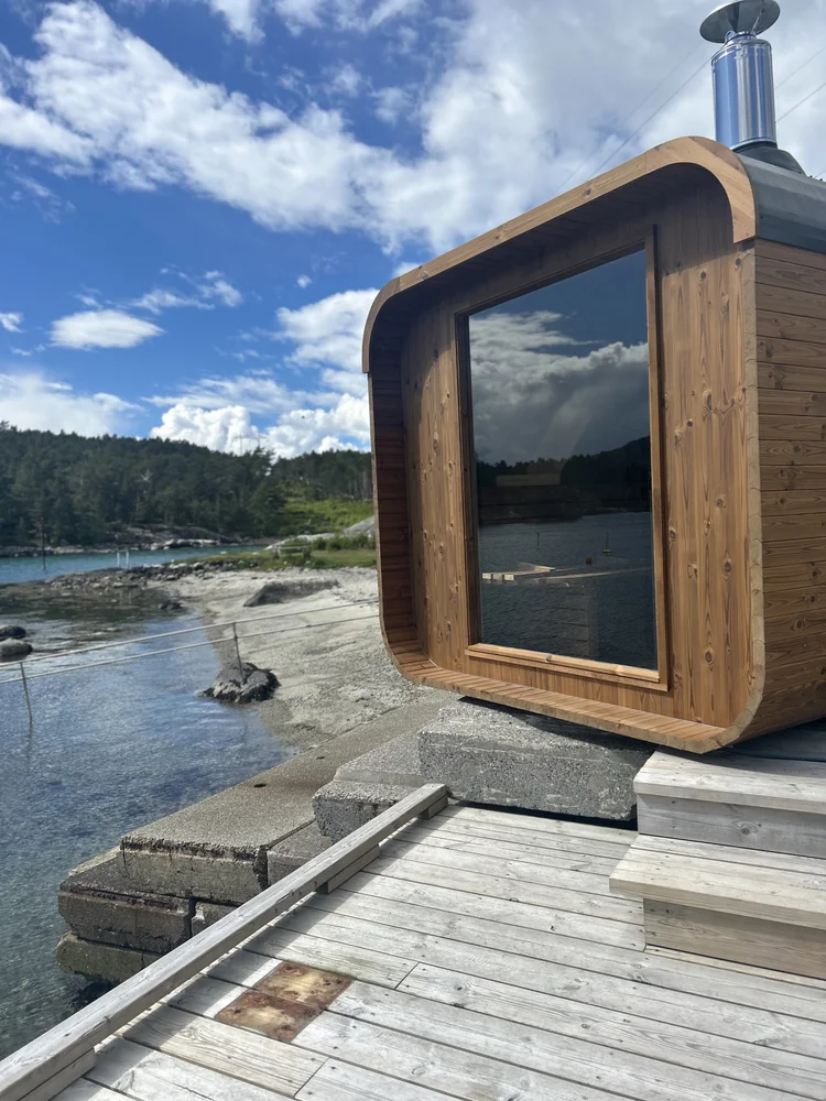Elektrisk badstue ved sjøkanten i Florvåg, på Bakarvågneset – alltid varm når du kommer. Her får du skikkelig løyly på rundt 80°C, kombinert med dusj og direkte tilgang til sjøen for den perfekte varm-kald-opplevelsen.